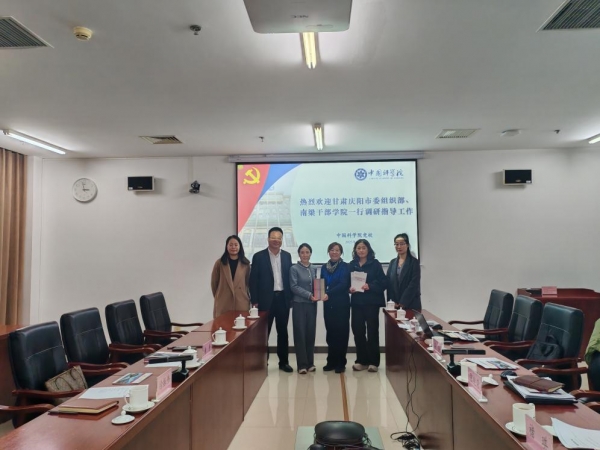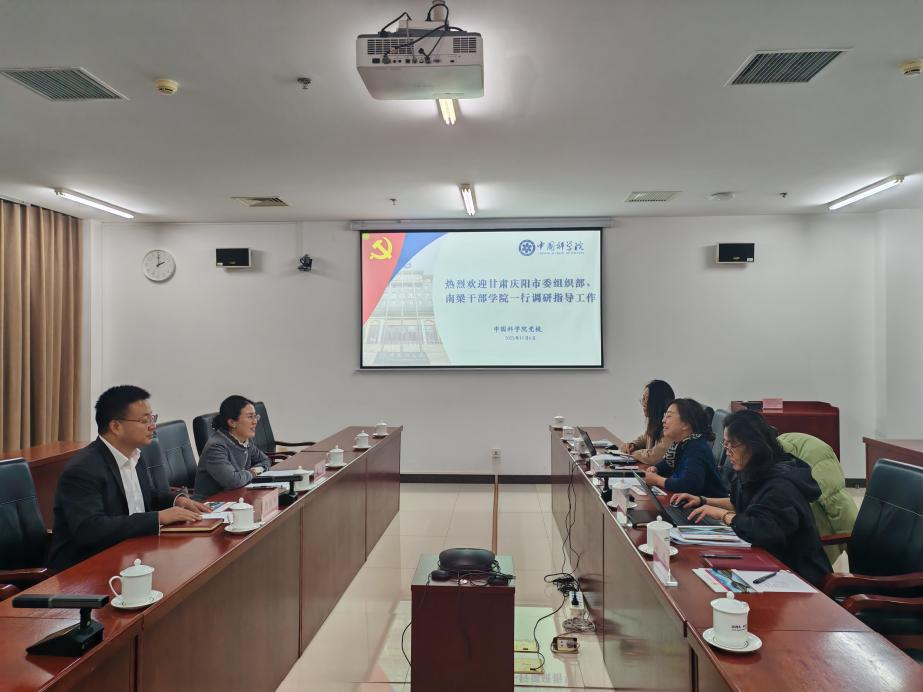 2025年11月6日下午,甘肃庆阳市委组织部副部长黄静、南梁干部学院常务副院长徐振伟来我校调研交流。中国科学院党校办公室主任吴静主持调研座谈会。