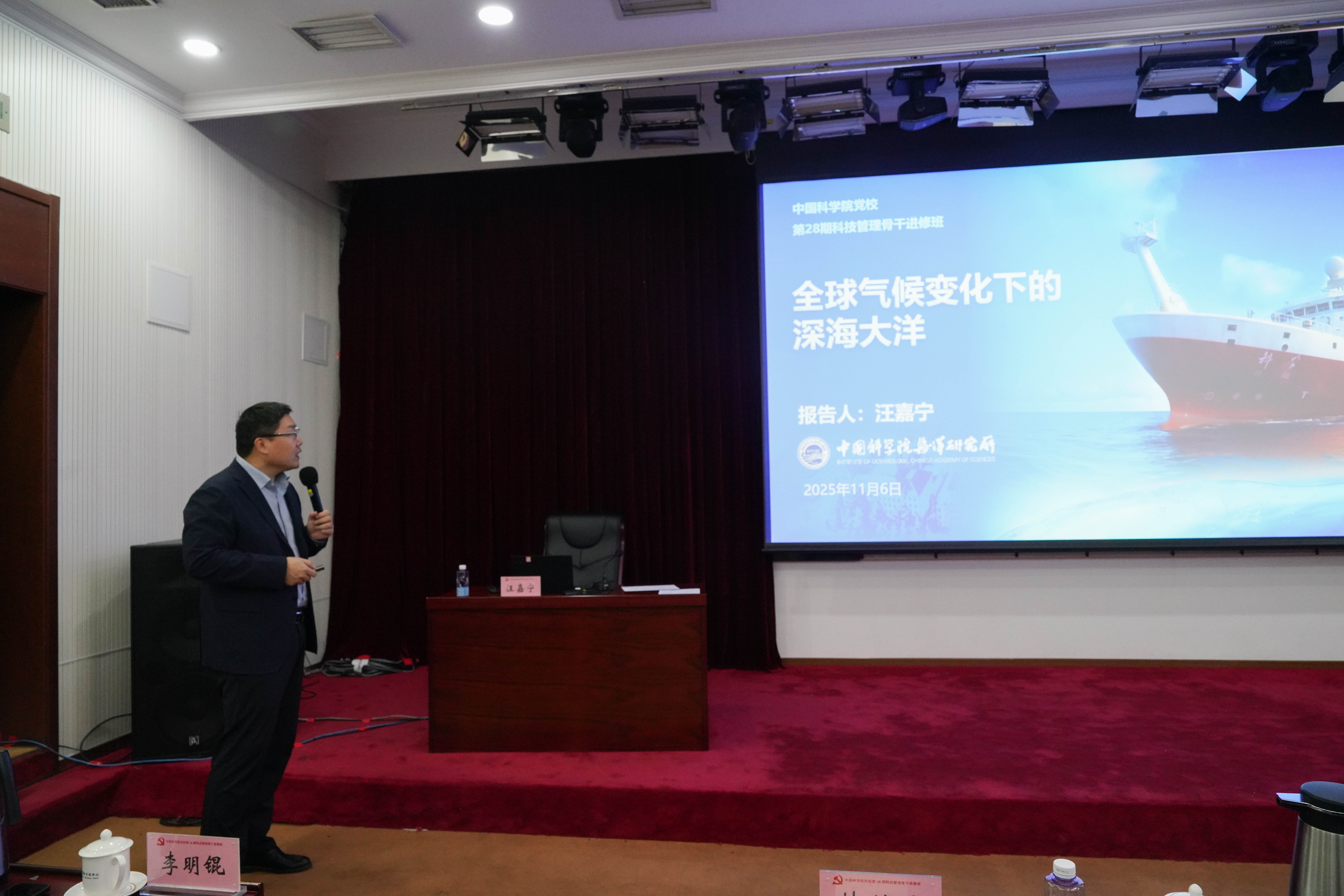 海洋研究所汪嘉宁学员以《全球气候变化下的深海大洋》为题,介绍了西太平洋对我国气候变化、动力灾害和海洋环境安全保障的显著影响;海洋所面向上述国家重大战略需求,构建了西太平洋科学观测网,包括重复性断面调查和浮标、潜标、深海着陆器组成的定点长期观测,并通过水下和卫星通信,实现了深海数据的实时传输。最后介绍了海洋科学正加速迈入大科学时代‌,基础、工程和高技术学科在海洋中均有涉及,期待各界英才投身海洋科研事业,在海洋中开展多学科交叉和联合协同研究,共同建设海洋强国。
