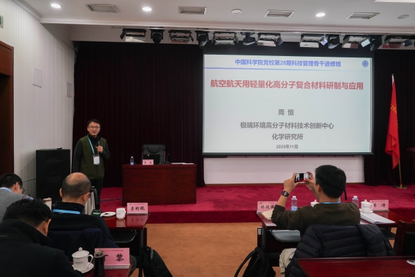 化学研究所周恒学员以《航空航天用轻量化高分子复合材料研制与应用》为题,介绍了高分子复合材料研究工作特色,面向国家重大需求,利用材料轻量化、高强度、结构功能一体化等特点,推动高分子复合材料在航空航天领域的高端应用。同时介绍了化学所利用人工智能新范式助力高分子材料研发的最新进展,化学所已经初步搭建了“化学智脑”与自动化反应装置联动的“干湿闭环”平台,为高分子复合材料的高效创智奠定了基础。