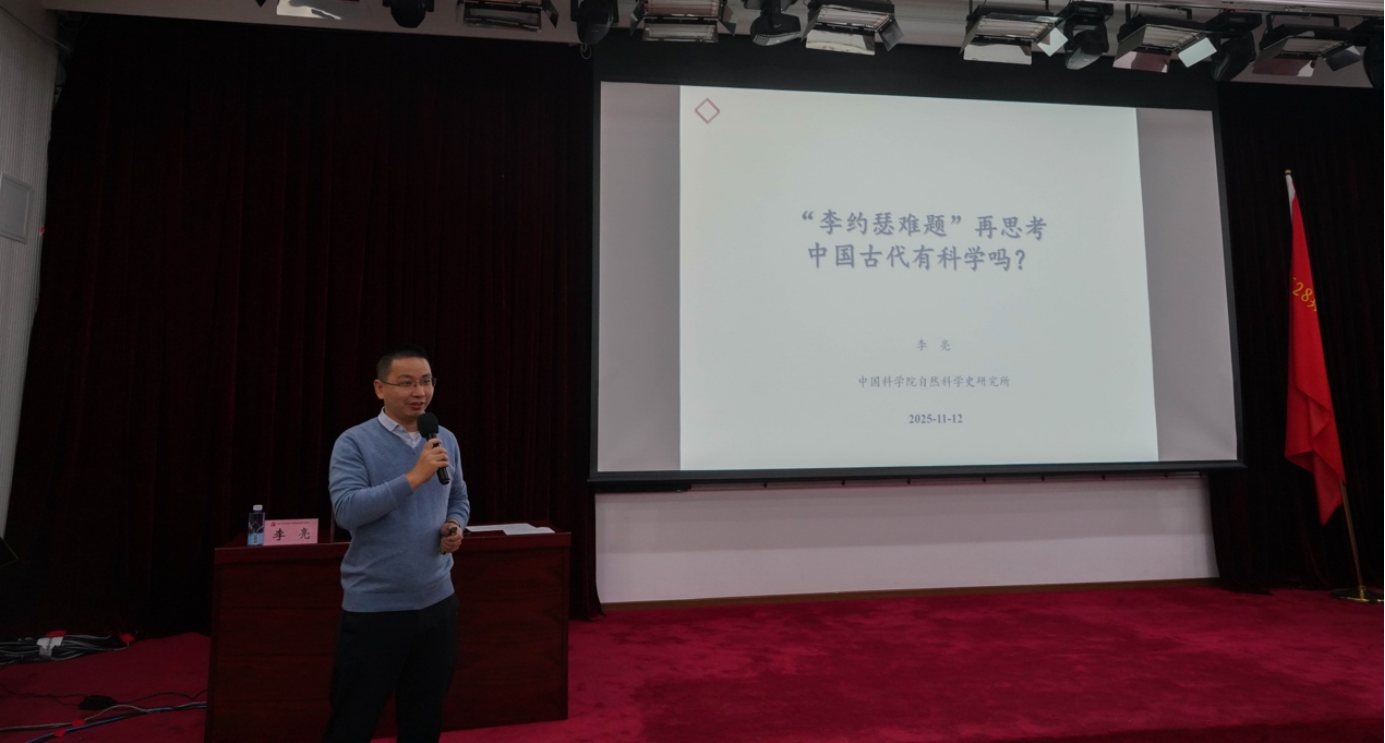 自然科学史研究所李亮学员以《“李约瑟难题”再思考:中国古代有科学吗?》为题,从“钱学森之问”和“李约瑟难题”切入,辨析了“科学”在不同历史语境下的内涵演变。报告重点对比了以《九章算术》为代表的中国传统数学“算法化、程式化”思想与古希腊数学的“公理化”范式,并指出前者如何启发了吴文俊院士开创“数学机械化”这一现代领域。同时,报告通过马王堆彗星图、席泽宗《古新星星表》等丰富史料,展示了中国古代天文学在国家体制下注重长期观测积累的独特特征,及其对现代天文学研究的现实价值和意义。最后,报告以“马拉松”与“接力赛”为喻,深刻阐释了中华科技文明独立且从未中断的特有发展路径。